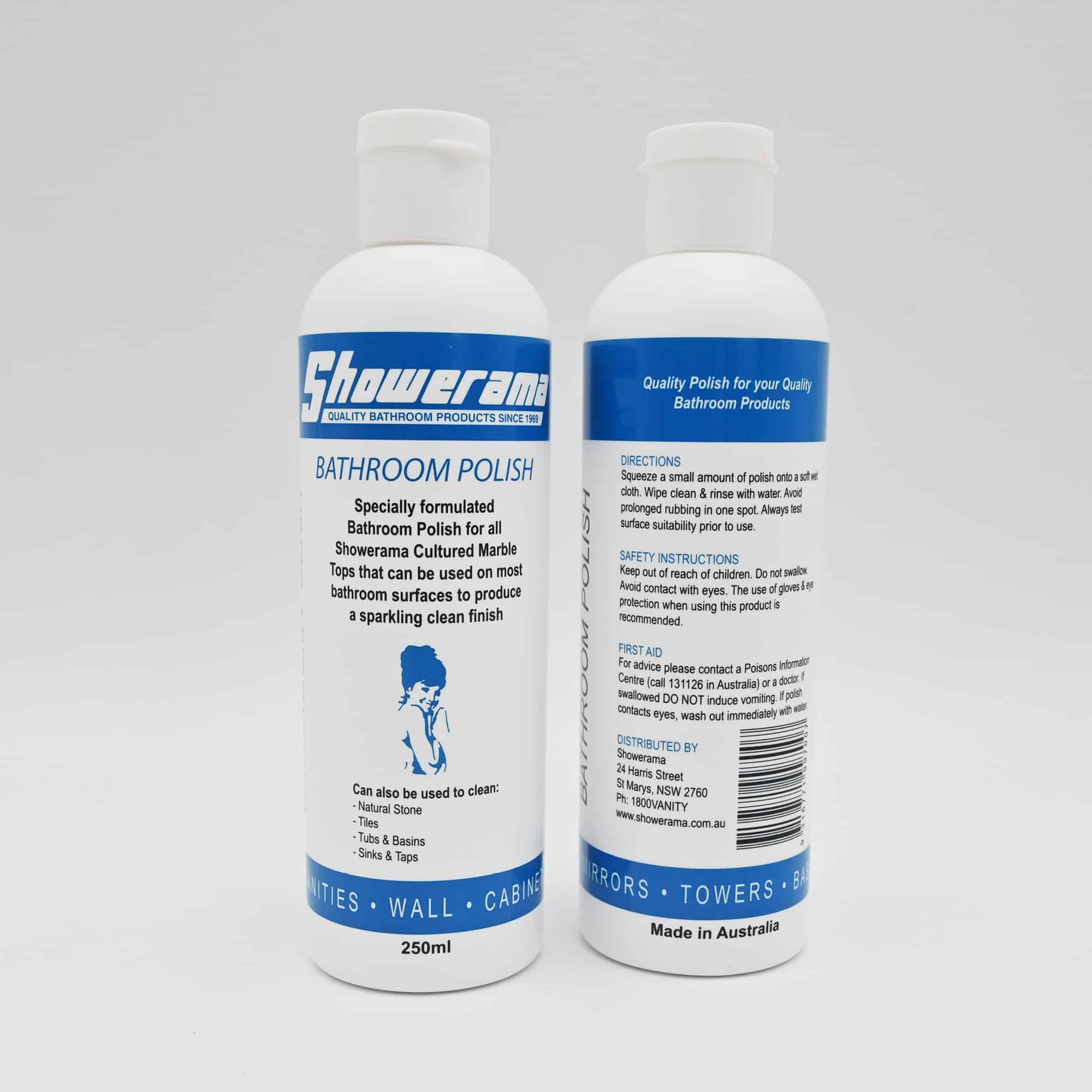 Showerama’s Bathroom Polish has been specially made for use on Polymarble vanity tops, acrylic, ceramic, fibreglass, mirrors, aluminium and all water-resistant bathroom surfaces.